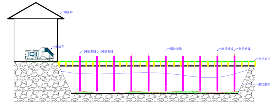 灌区渠道测流断面架设测桥,为了节省费用,在测桥上游侧铺设两条三角形平行轨道,轨道一端铺设到测流房内。在轨道上根据渠道断面宽度确定测量垂线位置及个数。启动测量时,测流车行至测点,进行水位、水深(淤积厚度)测量,并实时反馈测量数据及测量状态。测流车下放流速仪到固定深度进行单点流速测量或分层流速测量,测量完成后行至下一个测点进行测量。